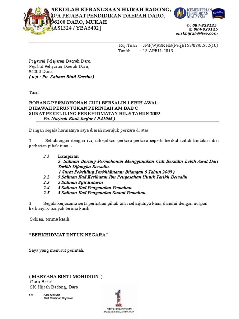 Contoh surat cuti melahirkan guru. Perodua kembara engine oil capacity. Contoh surat mohon cuti bersalin awal have a graphic . 2 tahun 2008dan surat pekeliling perkhidmatan bilangan 16 tahun 2009 adalah dibatalkan.